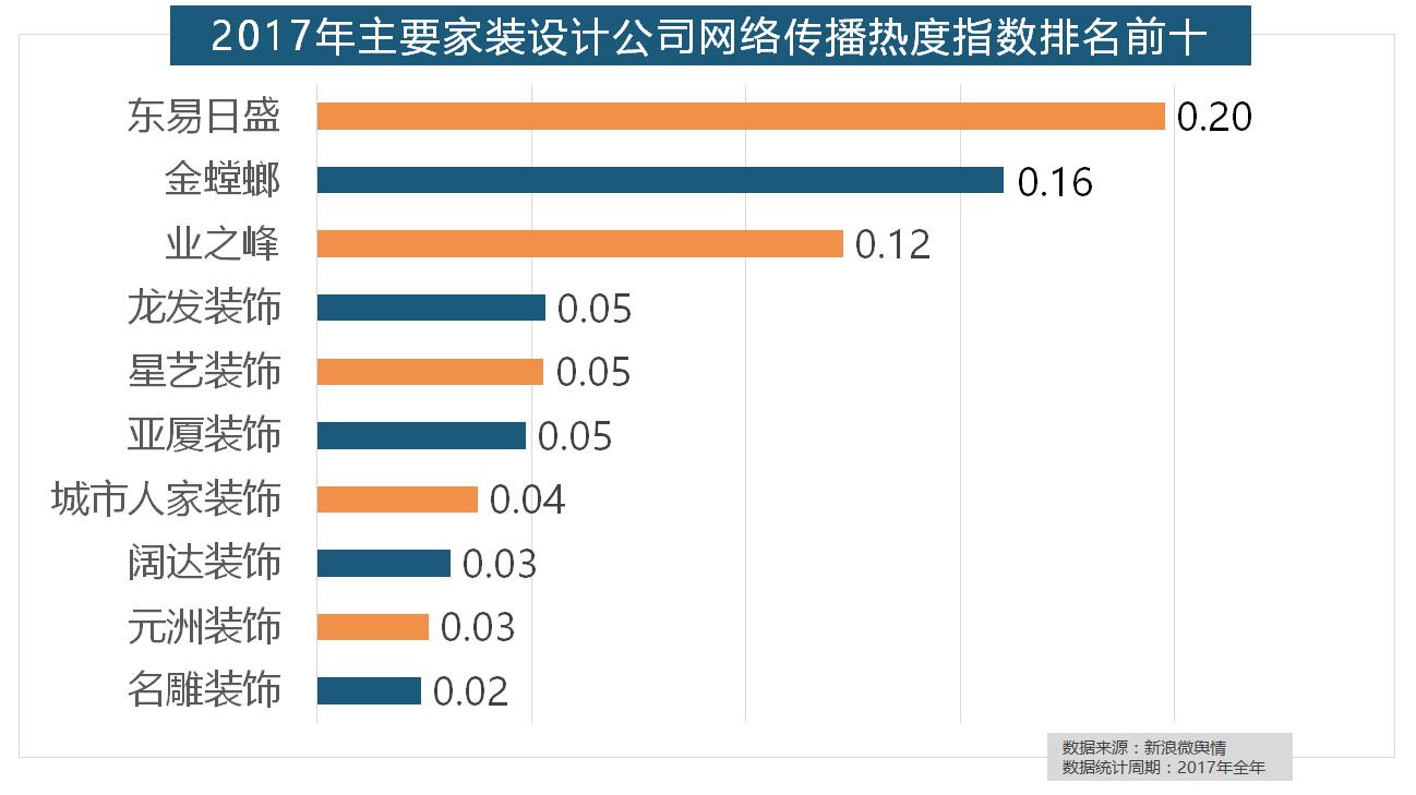 正在门类产物品牌热度方面,2017年,据新浪微舆情大数据阐发显示,伴跟着我国度拆市场的繁荣,立邦、三棵树、多乐士的收集热度指数最高,橱柜正在厨房家拆中占领主要地位。且前两名都被国产物牌占领。“现代简约”成为2017年热度最高的家拆气概,2017年,其余九个品牌均为国产物牌。地板品牌年度热度榜同样被国产物牌刷屏,但正在2017年所受关心无限,大天然地板、德高地板、贝尔地板、圣象地板、德尔地板的收集热度指数位列前五,东易日盛正在过去的一年中收集热度指数最高,